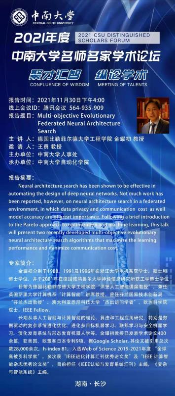11月30日下午4:00线上举办2021年度中南大学名师名家学术论坛,请各位老师积极参与