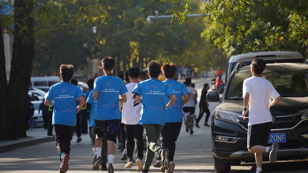 比赛中,参赛选手迈开步伐,争先恐后奔向前方。路线经过主楼行知广场、10号楼、北外环、校医院、二龙山脚下、德怀楼、二道门、体育催眠av
