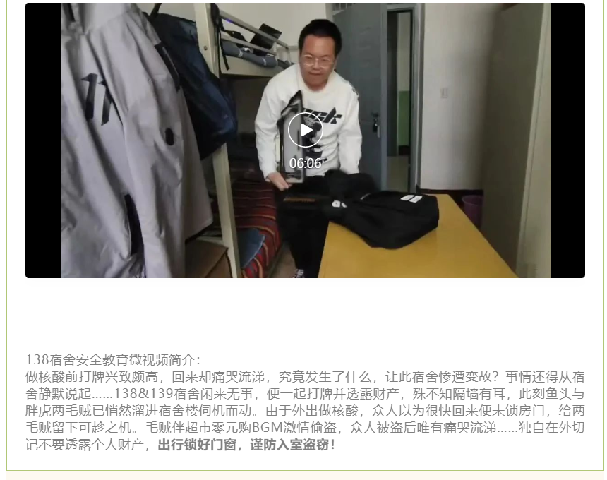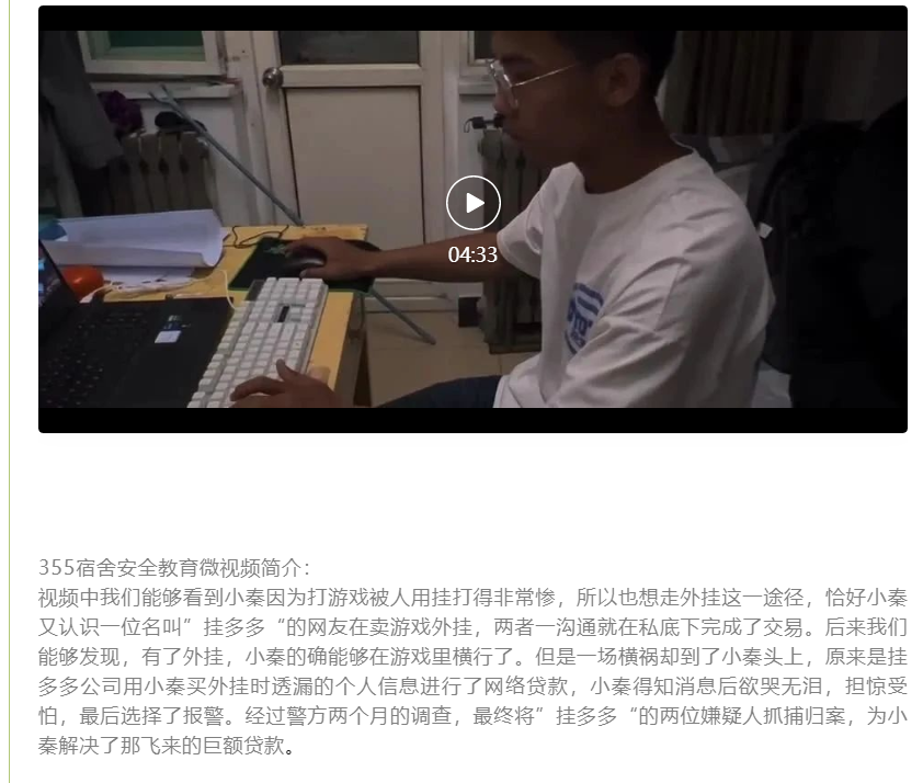 此次安全教育微视频大赛不仅让同学们深刻的体会到网络安全、宿舍安全重要性,同时丰富了同学们的学习生活。各类主题的微视频向同学们生动形象地展现了一些身边的安全隐患,让同学们学到了很多安全防范的知识,树立了预防网络诈骗、校园贷、就业诈骗等网络安全意识,以安全为导向,为建设良好的“平安校园”环境起到了积极作用。