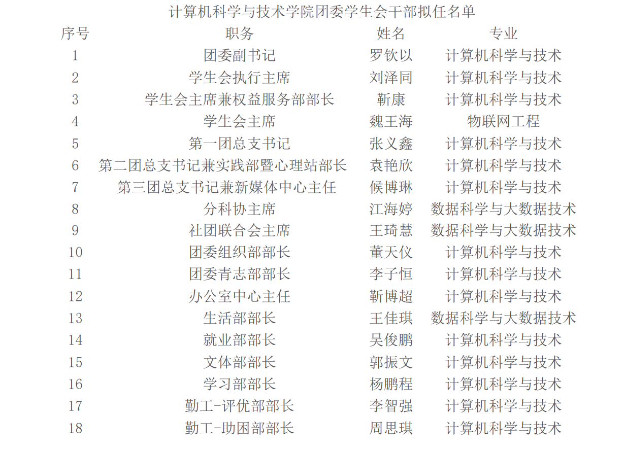 第三届团委学生会部长及以上学生干部,拟任期一个月,最终岗位设置及名单将于2022年11月公示,现将拟任名单公示如下: