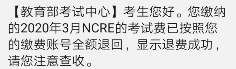 由于新冠疫情原因,2020年3月份全国计算机等级考试没有正常开始,现已开始对原来报名参加考试的考生的退费工作,所有报名参加2020年3月份全国计算机等级考试的考生都应该收到教育部考试中心发的一个短信,退费成功的短信内容为: