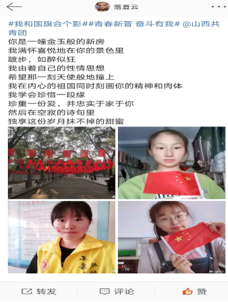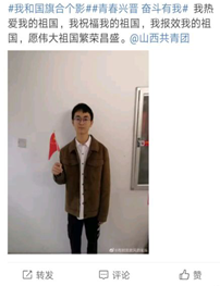 团员青年们积极响应号召,纷纷晒出合影,有的晒出自己在国庆假期参加志愿活动,手持五星红旗迎风飘扬的照片;有的晒出国庆出游,与满街的中国红的合影;更有部分备战考研的团员青年,为了复习,国庆坚持在图书馆自习,晒出了与政治书上五星红旗的合影。他们说,无论我的国庆假期过得怎样,当我站在国旗前,按下快门的那一刻,我的心中充满对祖国的无限热爱,洋溢着满满的自豪感。