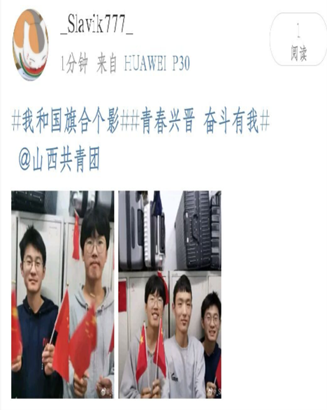 在国庆期间举办了“我和祖国合个影 ”和“青春兴晋奋斗有我”双话题微博线上活动,号召同学们晒出自己和国旗的合影并在微博平台带话题发布,以一种特别的方式为为祖国母亲庆生。院团委发出活动倡议后,各支部积极响应,广大团员青年们纷纷在微博上晒出了想对祖国说的话并留下了自己和国旗的合影,一起传达“我爱你,中国”的声音!