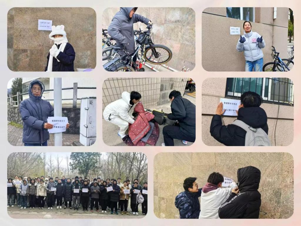 天空虽不作美,但恶劣的天气丝毫无法动摇同学们的热情与决心。同学们齐心协力,将那些横七竖八、随意停放的单车一一扶正并排列整齐,同时张贴上精心设计的文明停车标语。
