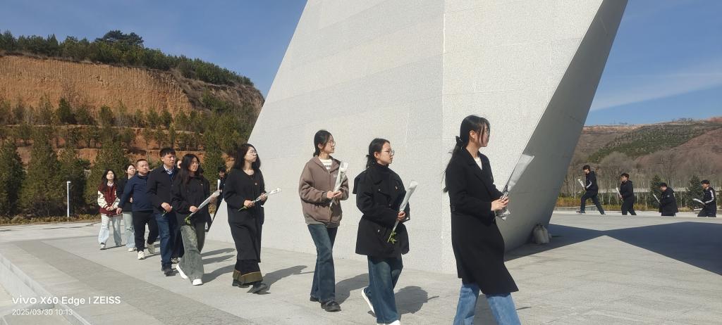 的段老师饱含深情的为同学们讲述了抗战时期先烈们用生命谱写的壮丽篇章:2323名安葬在这里的烈士平均年龄仅有23.5岁;一场童稚的躲藏游戏,竟将手足之情镌刻成永恒的守望;200多具无名尸骸中只有20多位烈士找到了后人;一位腿脚不便的85岁老人远赴千里来到只为在大巴车上看一眼他二哥的栖身之地……一个个鲜活的英雄形象在叙述中矗立,一段段浴血奋战的往事直抵心扉。可歌可泣的英雄事迹带领大家一同重温那段烽火连天、山河激荡的峥嵘岁月。之后全体党员面向党旗,举起右拳,庄严宣誓。党员代表向革命烈士敬献花篮,寄托着对先烈的深切缅怀。最后全体师生们缓步绕行瞻仰纪念碑并为烈士们献上素雅白花,将他们用热血写就的革命诗篇铭记心中。