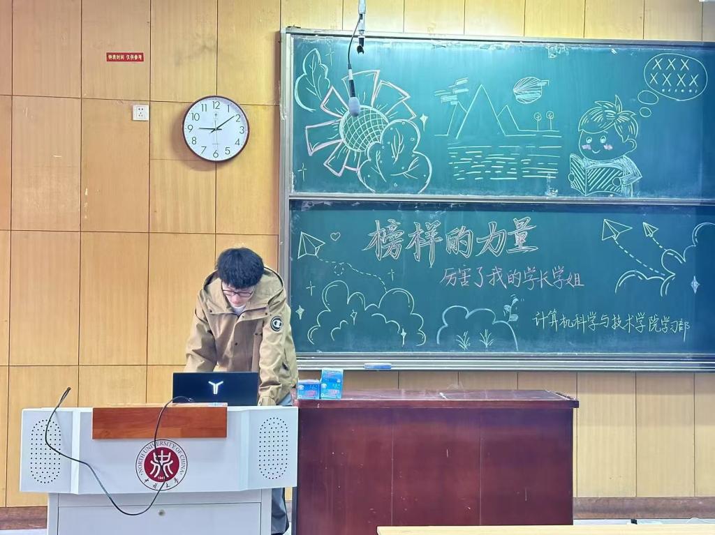 最后上台的是韩祥源学长。韩祥源学长以 “浅谈学习生活” 为主题,分享了他在本科阶段的成长历程。在学术背景方面,他平均学分绩点达 3.90,本学年综测排名 3/100,并成功保研至西安电子科技大学。他强调了课程学习的重要性,在科研竞赛方面,他参与的中国高校智能机器人创意大赛获得国家级二等奖,NCDA 未来设计师・全国高校数字艺术设计大赛获得山西赛区省级三等奖。作为项目负责人,他带领团队完成了超市巡检机器人、目标识别追踪系统等项目,锻炼了自己的科研能力和团队协作能力。在学生工作中,他担任过班长、学生会勤工评优部部长、新生班主任助理等职务,提升了抗压能力和责任意识。未来,他计划深入研究人工智能和计算机视觉领域,目标是进入互联网大厂或研究机构工作。